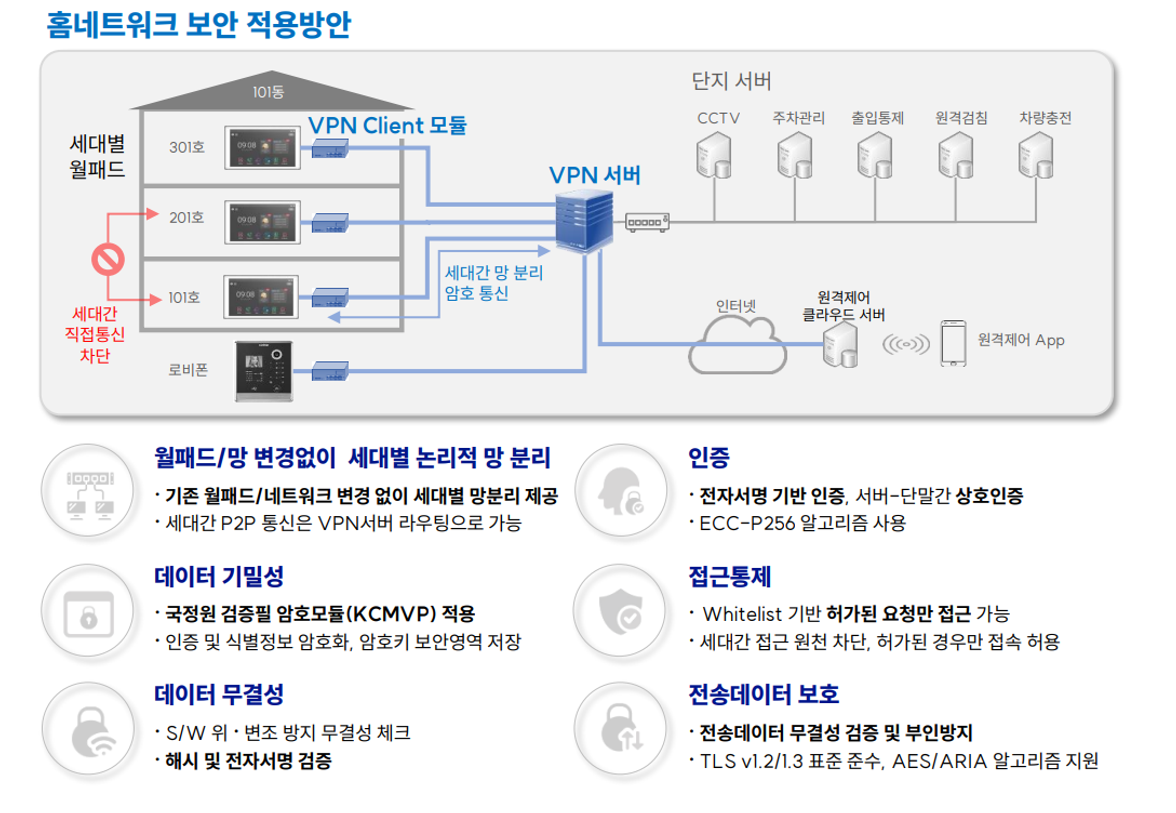 기존 월패드 망변경없이 적용가능하여 효율적이며, 암호 이즌기술로 보안성이 뛰언납니다.